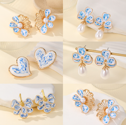 Minimalista Elegante Azul e Branco Porcelana Padrão Brincos para Mulheres Flor Coração Brincos Estilo Chinês Temperamento Atacado